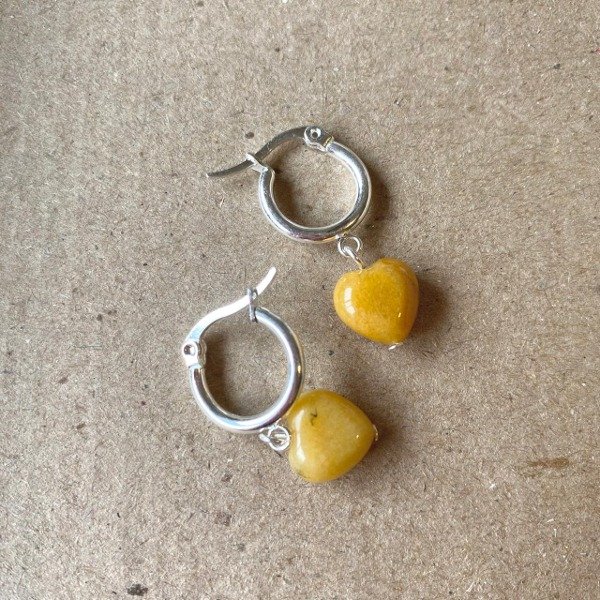 Argollitas de acero blanco con dije de corazon de vidrio amarillo/marron.