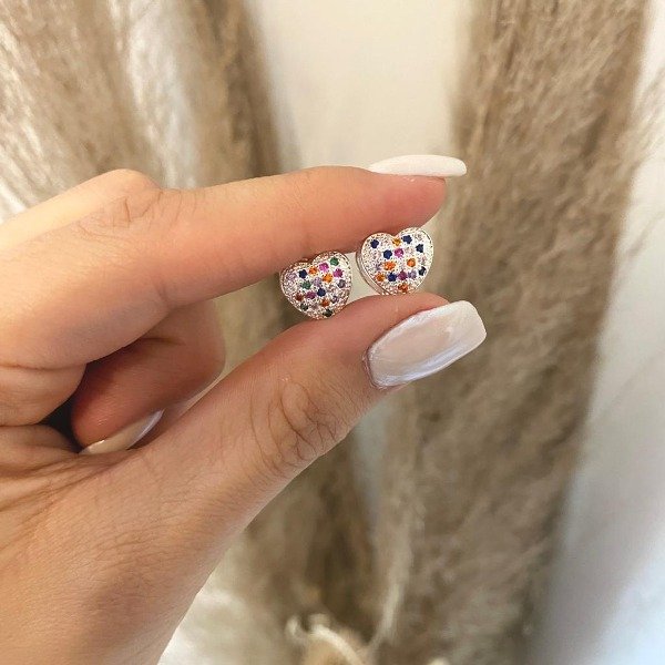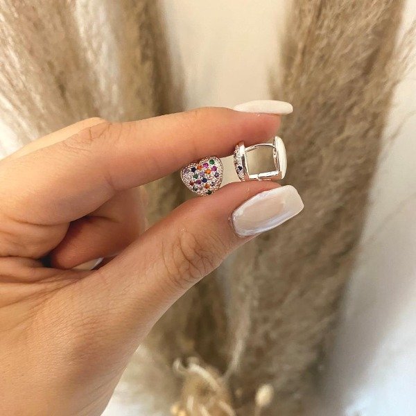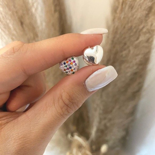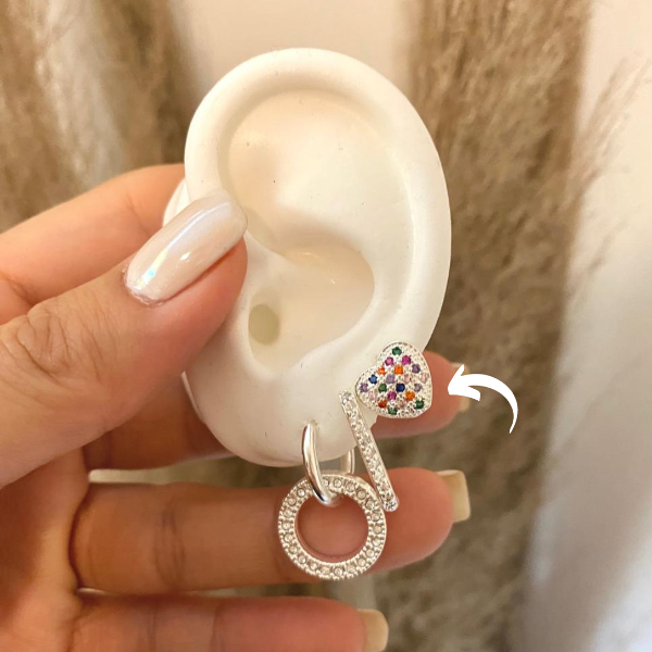 Argollitas de acero blanco premium con doble corazón y brillitos de colores.