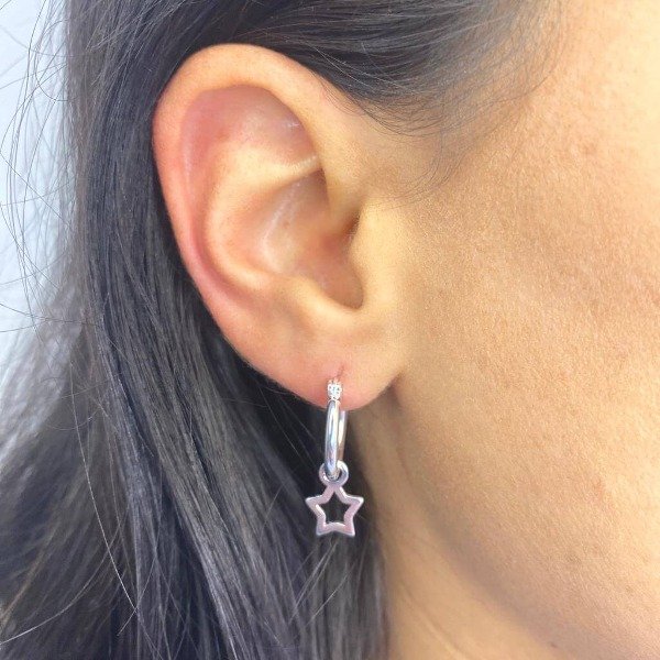 Argollitas de acero blanco con dije de estrella calada.