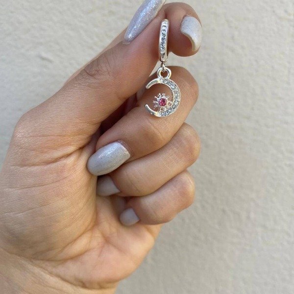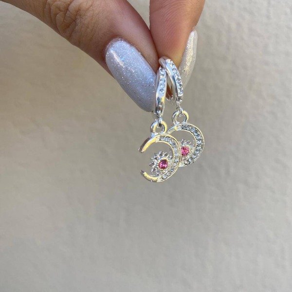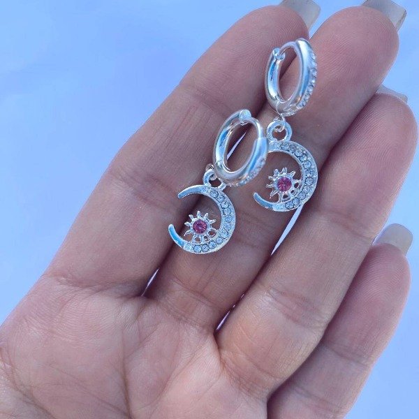 Argollitas de acero blanco con dije de luna y sol con piedrita rosa.