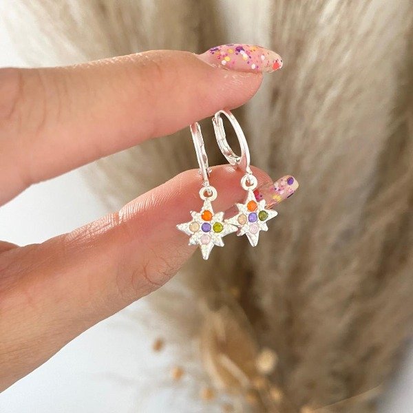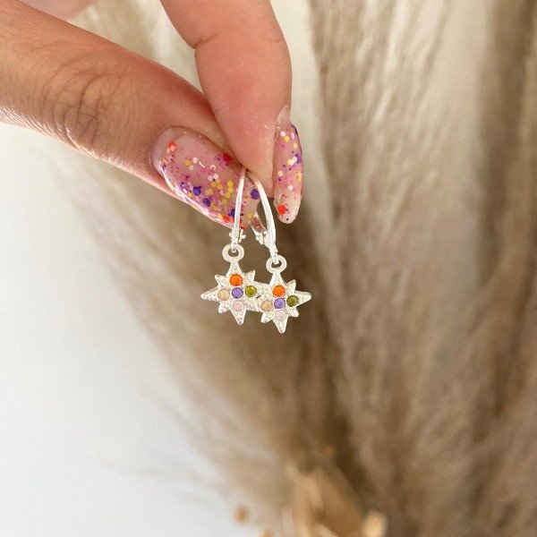 Argollitas de acero blanco con destellito y piedritas de colores.
