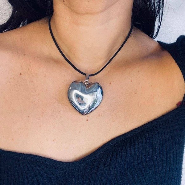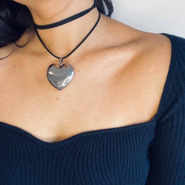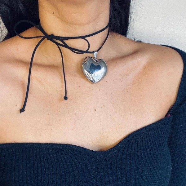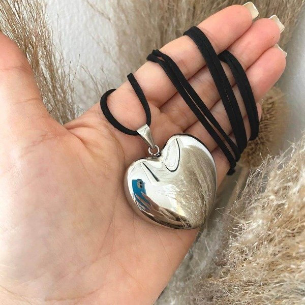 Collar con cordón y dije de corazón de acero quirúrgico. El cordón mide 114cm por lo que se puede usar el collar de varias maneras.
