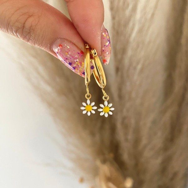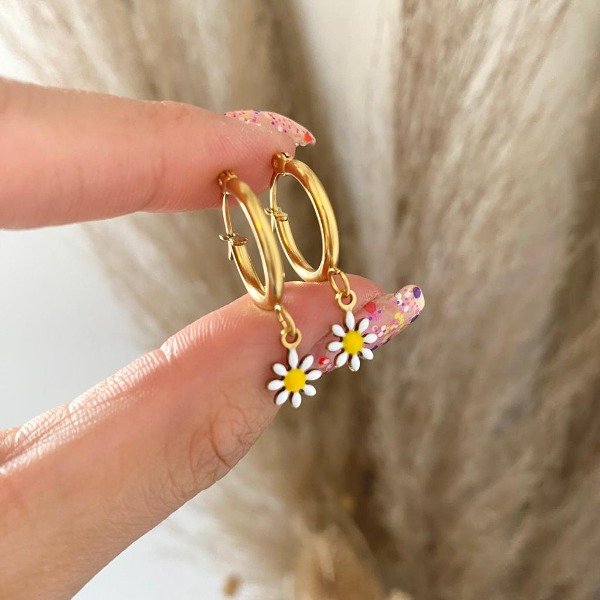 Argollitas de acero dorado con dije de flor blanca y amarilla.