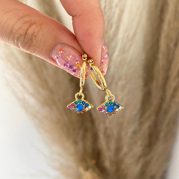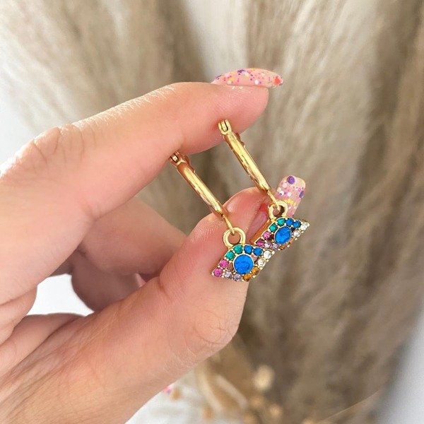 Argollitas de acero dorado con dije de ojito turco y piedrias de colores.