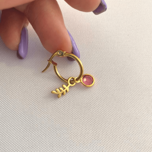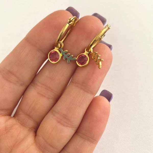 Aros de acero dorado con dije de cubic rosa y hojita.